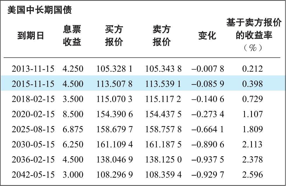 图2-3是一张中长期国债行情列表。以2015年11月到期的长期国债为例,其息票收益率,或者称为利率,是4.5%,即面值为1000美元的长期国债每年将获得45美元的利息,每半年支付一次,其买方报价为113.5078。中长期国债以面值1000美元为计量基准,买卖时按面值的某一百分比报价。因此买方报价113.5078的意思是面值1000美元的113.5078%,即1135.078美元。类似地,卖方报价为1135.391美元。