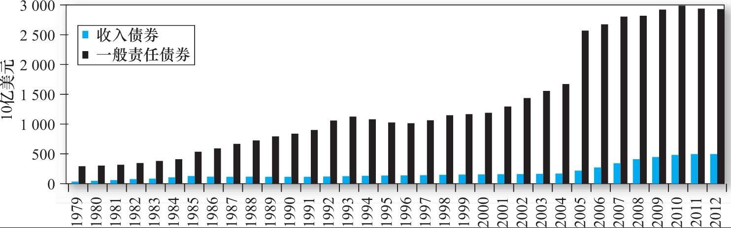 市政债券通常分为两类:一般责任债券(general obligation bond)和收入债券(revenue bond)。一般责任债券完全由发行者的信用支撑(即征税能力);而收入债券是为特定项目筹资而发行的,并由该项目获得的收入或运作该项目的特定市政机构担保。收入债券的发行者通常是机场、医院、公路和港口管理机构等。很明显,收入债券的违约风险高于一般责任债券。图2-4描绘了两类市政债券的债务总额。