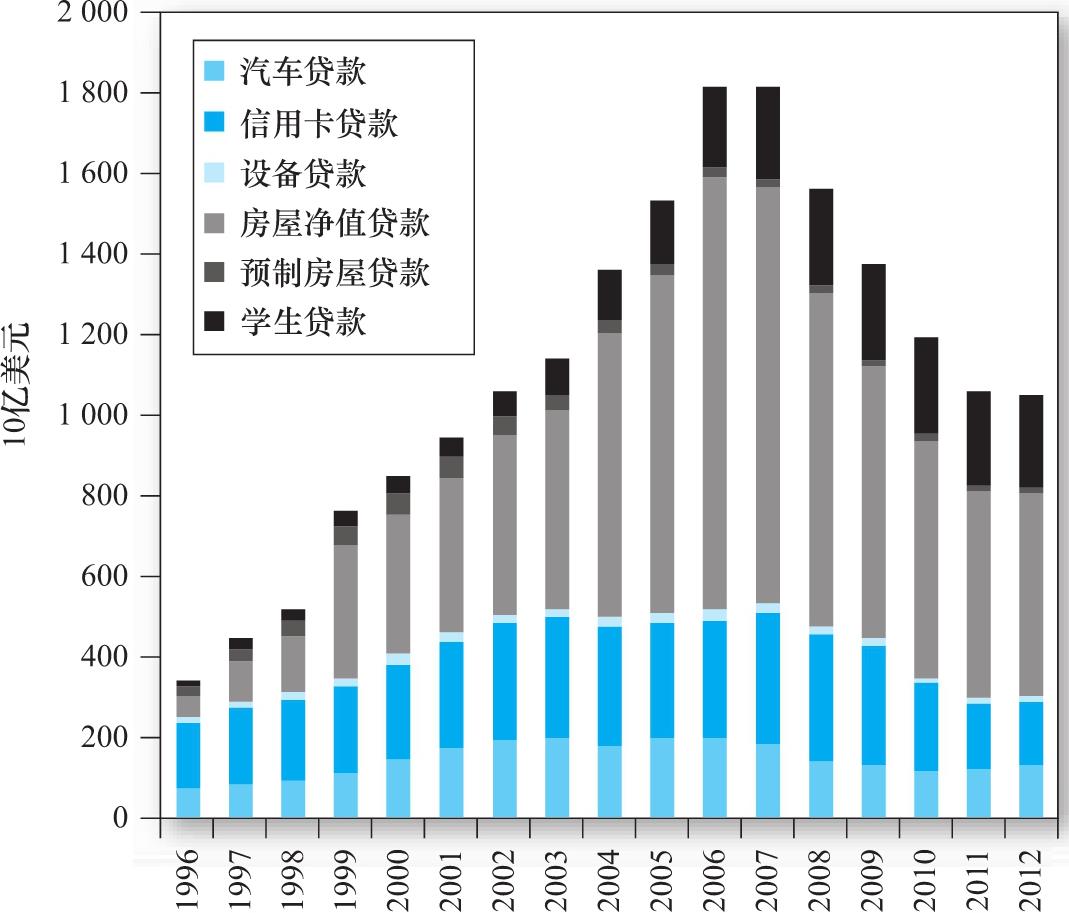 过去几年间,市场上的操作更为谨慎保守,尤其是最终借款者需严格符合信用标准。尽管存在这些问题,但没有人相信资产证券化会终止。事实上,资产证券化在众多信贷领域已越来越普遍,例如,汽车贷款、助学贷款、房屋净值贷款、信用卡贷款甚至私营企业的负债现在经常打包为转递证券在资本市场上交易。图2-7描绘了自1996年以来非抵押贷款资产支持证券的快速增长情况。2007年的前十年中,资产支持证券市场规模扩大了5倍。金融危机爆发后,对信用卡和房屋净值贷款违约风险的担忧激增,因此整体规模有所下降,但其依然是巨大的。