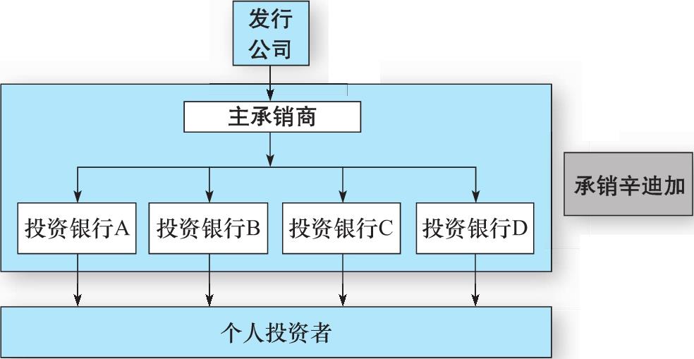 通常情况下,投资银行在股票和债券的公开发行中扮演了 承销商(underwriter) 的角色。负责推销证券的投资银行通常不止一家,而是以其中一家为主承销商、其他多家投资银行辅助承销的辛迪加组织来分担股票发行任务。