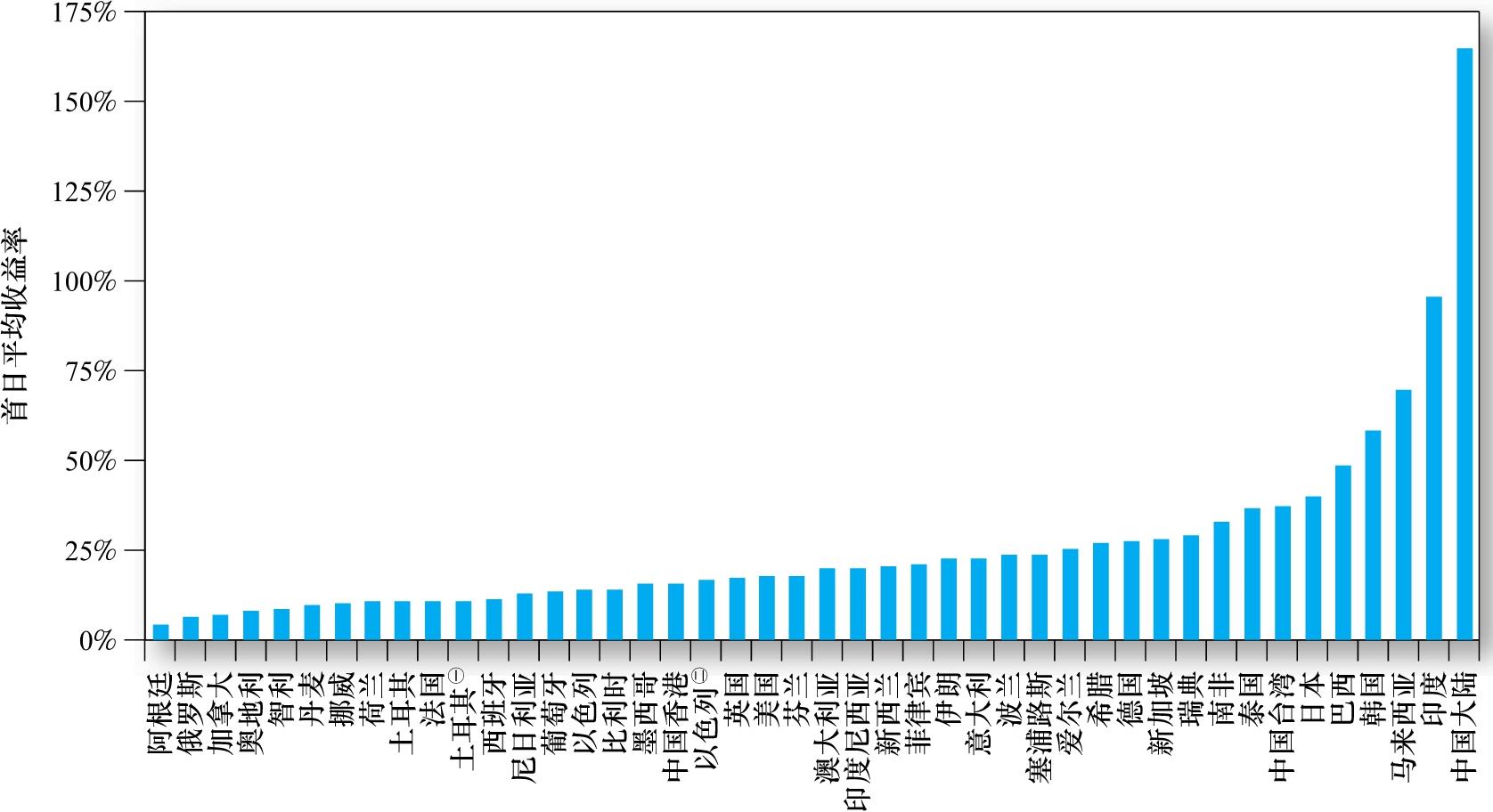 首次公开发行的显性成本大概是募集资金的7%,抑价也被视为公开发行股票的另一种成本。如果Groupon以每股26.11美元价格发行股票,投资者也明显乐于接受这一价格,Groupon因此可能比实际多募集30%的资金。在本例中,留在桌面上的钱 远远超过股票发行的显性成本。抑价发行是金融市场中的普遍现象。图3-2列示了世界多个国家和地区股票首次公开发行的首日平均收益率,图中的数据一致表明首次公开发行价格对投资者而言极具吸引力。
