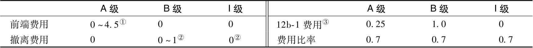 【例4-2】不同等级基金的费用表4-2是德莱弗斯首要成长基金2012年各等级基金费用情况。在选择A级还是C级时注意前端费用和12b-1费用之间的权衡。I类股只出售给机构投资者,收取少量费用。