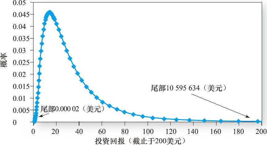 图5-9画出了期末可能价值的发生概率,可以看出分布的非对称性是很明显的。很高的正偏度表明标准差对风险的度量并不适用。实际上,以复利计算多期二项分布的终值时,其收敛于 对数正态分布 (lognormal distribution) 。对数正态分布描述的变量在取对数后服从正态分布。