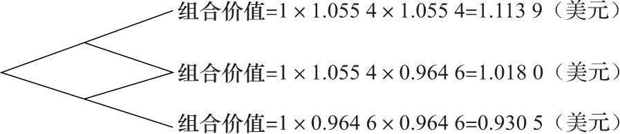 仿照之前的例子,我们继续用二叉树来构造一个股票基金终值的概率分布。与之前不同的是,这次不采用月利润简单相加,而是根据分布确定一个收益率并以之按复利计算终值。例如,假设某个股票组合的月收益率可以近似看成如下分布:月收益率50%的可能性是5.54%,50%的可能性是-3.54%。这种构造的月期望收益是1%,其风险用月收益标准差来衡量是