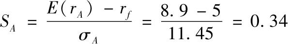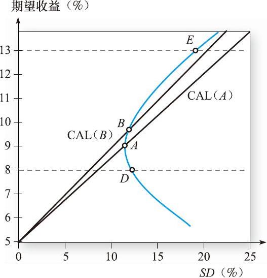 两条资本配置线分别连接5%的无风险利率点和两个可行风险资产组合。第一条通过最小方差组合A,82%风险资金投资于债券,18%投资于股票(见表7-3)。组合A的期望收益为8.9%,标准差为11.45%。当短期国库券利率为5%时,其报酬-波动性(夏普)比率,即资产配置线的斜率,为