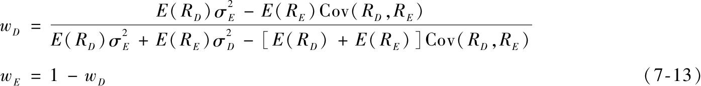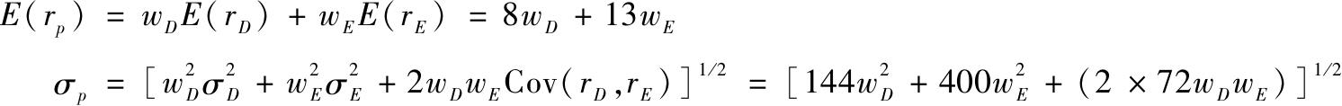 (注:两风险资产的求解过程如下:用式(7-2)替换E(r P ),用式(7-7)替换σ P ,用1-w D 替换w E ,对变换后的式子S P 求w D 的导数,令其为零,然后求出w D 。)