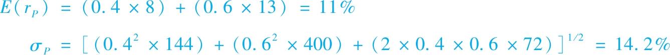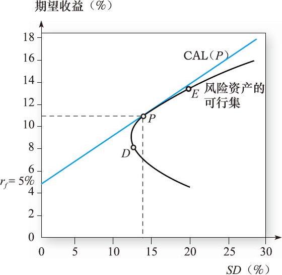 但是何必止于B呢?我们可以把资本配置线继续向上旋转直到最后和投资组合可行集相切,可得到最高报酬-波动性比率的资本配置线。因此,图7-7中那个切点组合P是最优风险组合。从图7-7中我们可以得到期望收益和标准差为E(r P )=11%,σ P =14.2%。