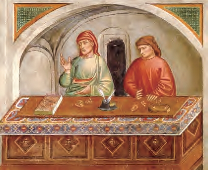 经济学的研究对象一个是财富,另一个是创造了财富的人。我们日常生活中普遍的衣食住行等事务都是经济学研究的对象。图为中世纪的佛罗伦萨商人在柜台上进行储蓄活动,他们和他们储蓄的钱都是经济学的研究对象。