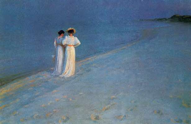 一个国家的河流是该国的国家财富,地球上的海洋则是世界财富中最有价值的一部分。总之,世界财富是国家财富在整个地球上的扩大化。图中两位穿着高雅的女人在海岸边漫步,海洋和天空在天际处融为一色,制造出宁静的气氛。图中的海洋属于世界财富之一,在计算世界财富时不可遗忘。