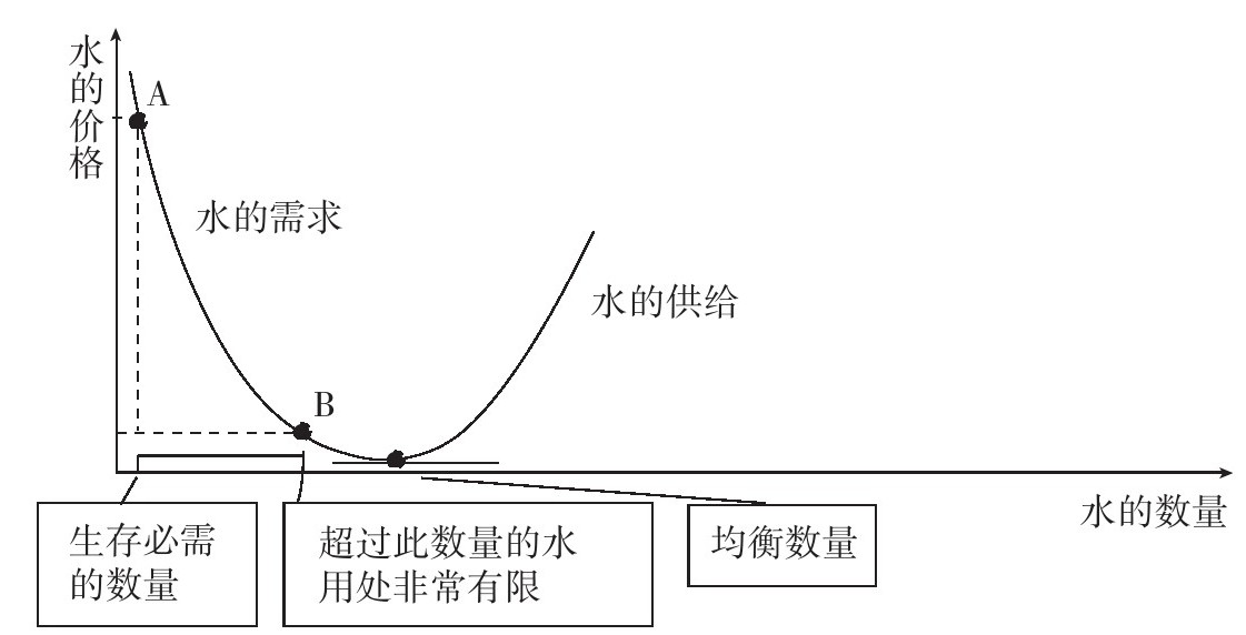 世界上大多数有人居住的地方,水是容易得到的,因此,能以较低价格得到水的充分的供给。在正常情况下,水的供给曲线与需求曲线在点B的右边相交,如下图所示;因此,得到的是较低的均衡价格。当然,在沙漠中,水的供给是极其有限的,水的价格也可能升到非常高的水平。但在点B右方,人们已经有大量的水,对于一个增量,人们不再愿意支付更多。水的价格由供给曲线和需求曲线的交点决定。