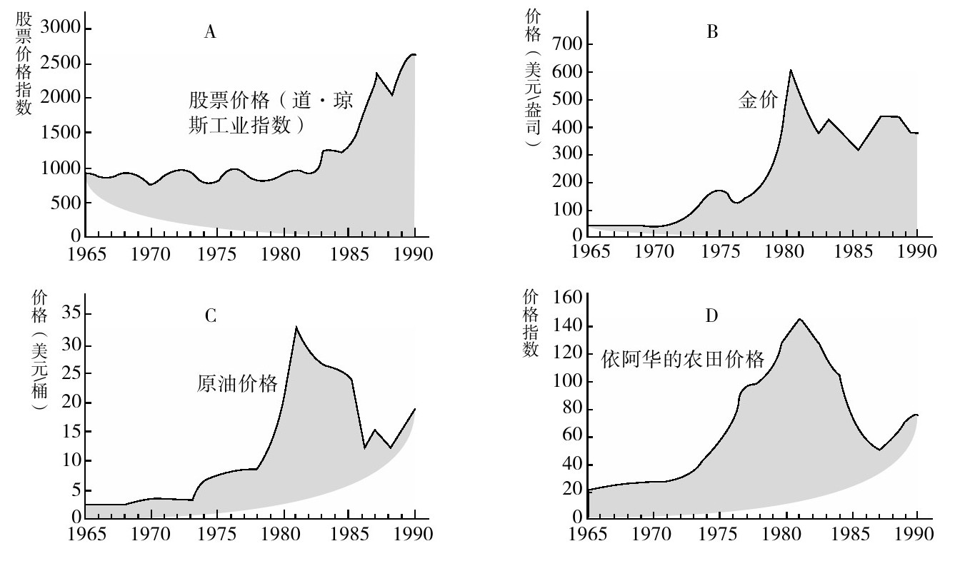 某些资产(如股票、黄金、石油和农田)的价格在1965年和1990年间急剧变化。这些价格波动可以在下图中的四幅图形上看到,这些图显示了四种资产价格是怎样上升和下落的。如果你在较低点购买,并在较高点出卖,你可能会发财;但如果你在较高点购买,而在较低点出卖,你可能很容易就会破产。