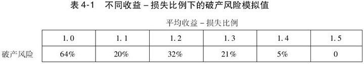 模型计算的结果见表4-1。对于每一次模拟,我假设方法有50%的准确率,交易商拥有20单位的资金。我将账户上的资金减少50%定义为破产。对于每个回报率(平均收益:平均损失),我模拟30次,然后取平均值产生一个破产风险值(附录C是对30次模拟的汇总)。除1.1: 1的回报率以外,这个简单的模型证实了较高的回报率减少破产风险。从这个例子中可以看到,你唯一想要交易的回报率是1.5: 1,因为它模拟的破产风险是0%。所有其他的都在0%以上,因此保证你将会失败,这只是时间问题。