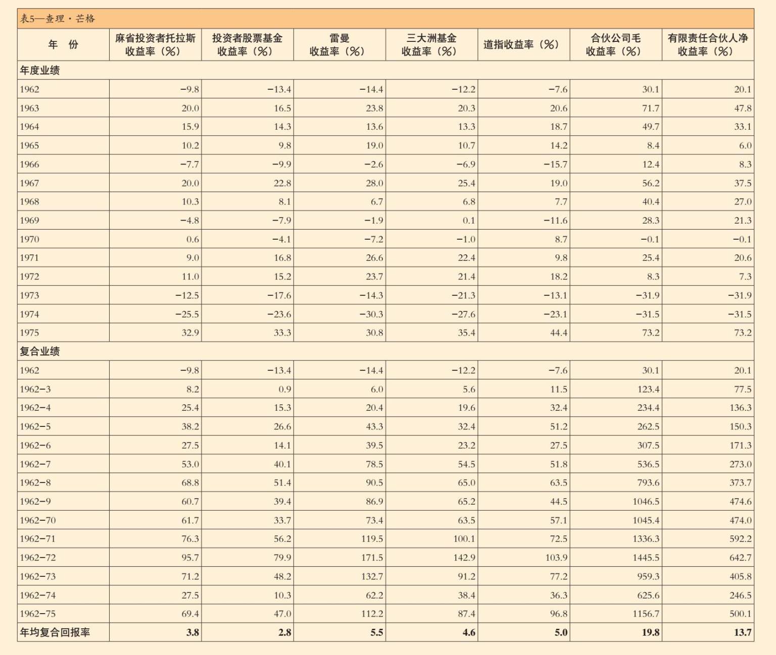表5的业绩属于我的一位朋友,他是哈佛法学院的毕业生,也是一家大型律师事务所的创办人。我认识他是在1960年前后,当时我告诉他,当律师作为爱好不错,但他可以做得更好。他成立的合伙公司和沃尔特(沃尔特·史洛斯,该文提到的另一位超级投资者)的完全不同。他的投资组合集中在非常少的几只股票上,因而,他的投资业绩波动要大得多,但也是基于同样的价值投资策略。从历年的结果可以看出,他愿意接受业绩出现更大的起伏,他恰好是一个心理结构倾向集中的人,业绩显示也是如此。碰巧的是,这份业绩属于查理·芒格,他是我的合伙人,多年来和我共同管理伯克希尔·哈撒韦。然而,当他运作他的合伙公司时,他的投资组合和我以及前面提到的几位几乎完全不同。