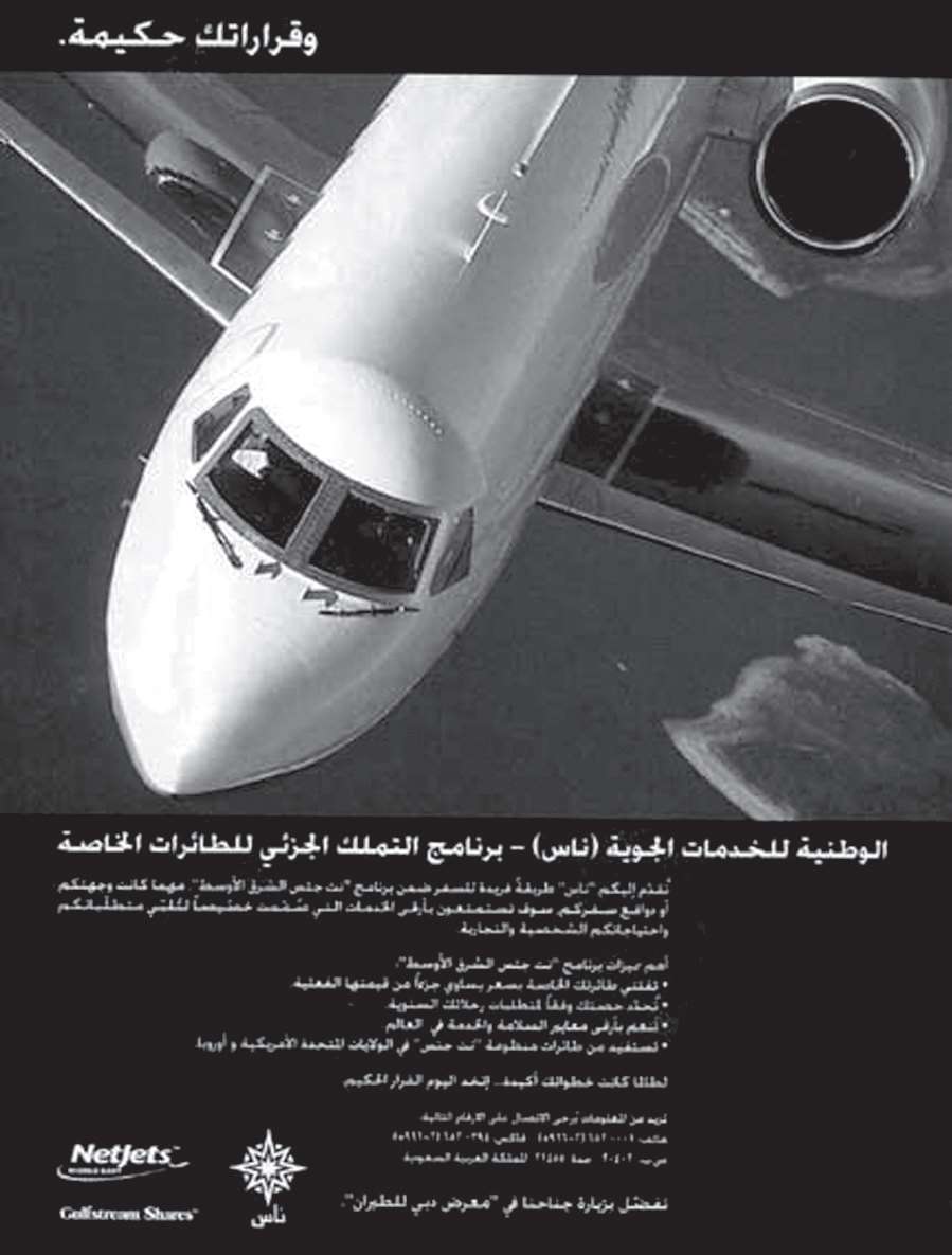 1998年,伯克希尔收购了Netjets飞机租赁公司,它是查理和沃伦收归伯克希尔旗下的许多成功企业之一。在里奇·桑图利——产权分享的鼻祖——的有效管理之下,这家公司继续在世界各地扩展业务,下面的阿拉伯文广告便是证据。