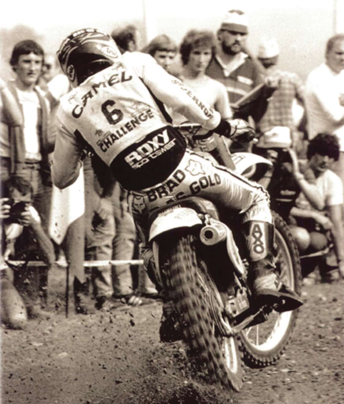 布拉德·拉奇在1982年的卢森堡大奖赛上全速滑行,引起观众的欢呼。拉奇是第一个获得国际摩托车比赛冠军的美国人。他和CZ摩托(一种捷克斯洛伐克的高级摩托车)公司有过多年的亲密合作关系。(本书的编者以前也是这些喜欢摩托越野赛的傻子之一。)