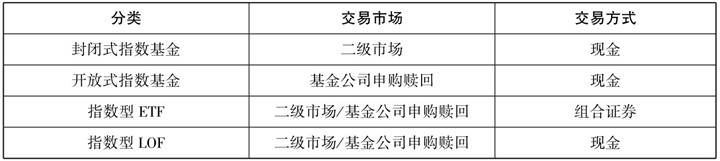 按交易机制分,指数型基金可以分为封闭式指数基金、开放式指数基金、交易型开放式指数基金(指数型ETF)和上市型开放式基金(指数型LOF)。