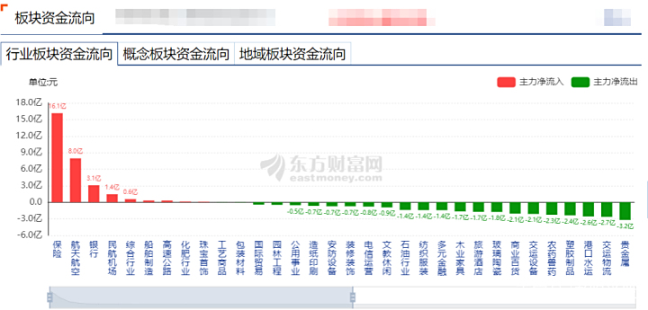 板块资金流向:保险、航空航天、银行、民航机场、综合行业、船舶制造、高速公路等。