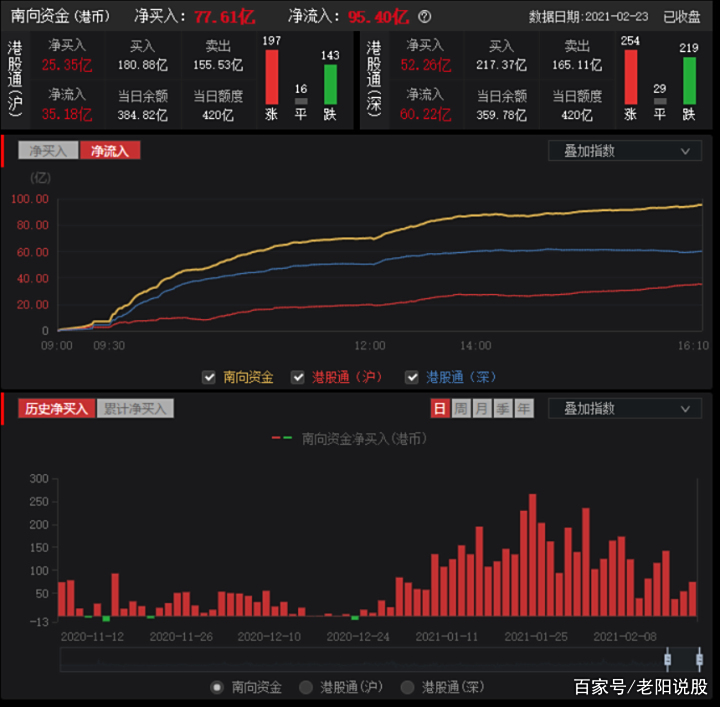 南向资金流向:净买入77.61亿港币,净流入95.40亿港币。