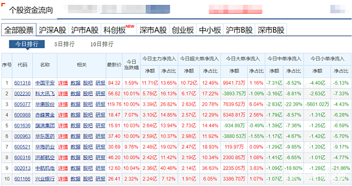 个股资金流向:中国平安、科大讯飞、华康股份、赤峰黄金、旗滨集团、华东医药、华海药业、洪都航空、中航机电、兴业银行。