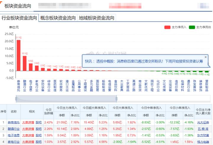 板块资金流向:主要流入板块为券商信托、酿酒行业、电子信息、家电行业、安防设备、综合行业、医药制造、软件服务等。主要流出板块为塑胶制品、装修装饰、珠宝首饰、通讯行业、包装材料、造纸印刷等。