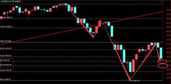 最后来看,自上周连续下跌,上证指数在60分钟上走出了一个类似ABC三浪回调的节奏,那么本周初的两根交易日反弹,形成了C浪过后的反弹一浪。目前的下跌,按照比例计算,回调的位置处于本次反弹的半分位附近,不排除明日继续考验一下4440点的0.382位置,不跌破这个位置,目前回调先当2浪看看。