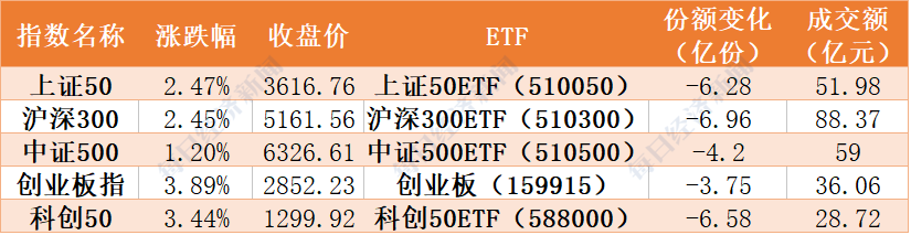 在跟踪主要指数方面,本周5只主要指数ETF份额集体出现减少,沪深300ETF、科创50ETF、上证50ETF、中证500ETF和创业板,则分别减少了6.96亿份、6.58亿份、6.28亿份、4.2亿份和3.75亿份。