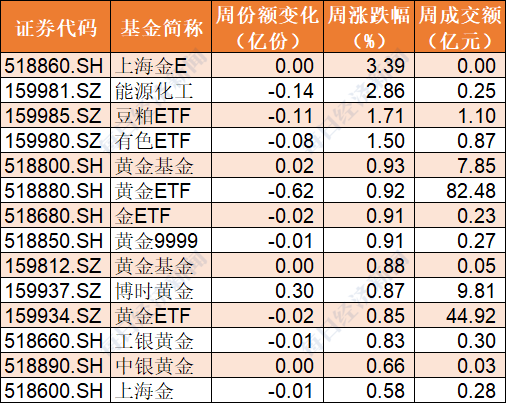 商品ETF本周全线上涨,其中上海金E、能源化工分别涨3.39%和2.86%;此外份额上,均没有增减过亿份的品种。