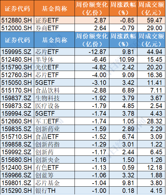 在行业主题ETF方面,本周份额增长超过1亿份的有2只基金,证券ETF和券商ETF分别增加了2.87亿份和2.64亿份。