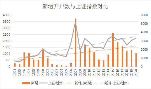 男性投资者的比例占79%,女性占21%,未来的新股民只会越来越年轻,因为投资者进场一般是集中在牛市大批进入,中间的自然增量并不大,而随着2007年和2015年两次大的牛市和一次一人多户的政策,导致的开户数大增的现象,估计在未来将很难看到了。