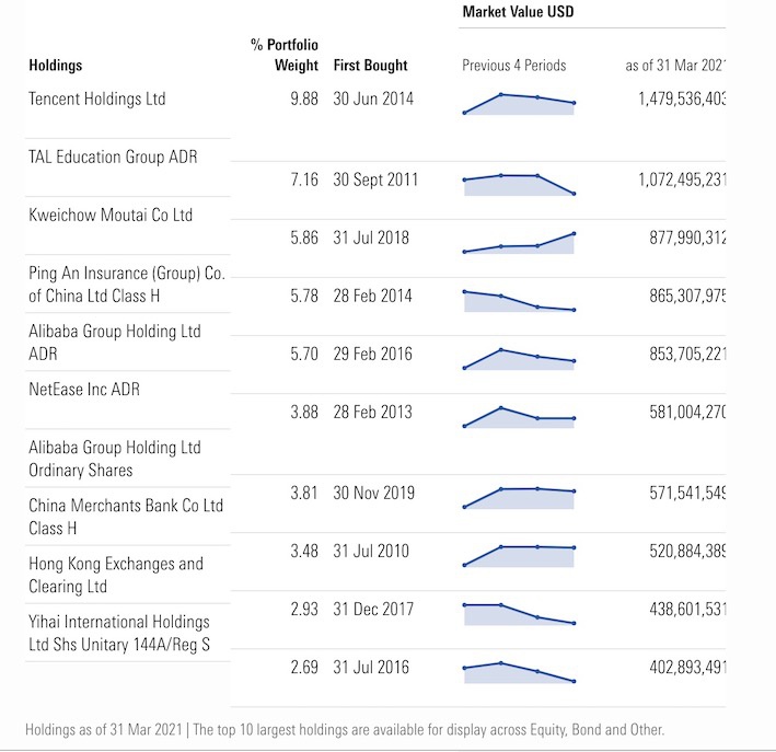 而根据晨星数据,截至3月31日,贵州茅台上升为第三大持仓(5.86%)。前十大持仓还包括:腾讯(9.88%)、好未来(7.16%)、平安集团(5.7%)、网易(3.88%)、阿里巴巴(3.81%)、招商银行(49.720, 0.28, 0.57%)(3.48%)、港交所(2.93%)、颐海国际(2.69%)。