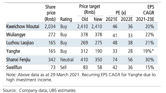 3月,瑞银最新将泸州老窖(236.720, 5.05, 2.18%)的评级从中性升级为买入,并更新了优先级,依次是五粮液、泸州老窖、茅台和洋河,同时对山西汾酒(351.680, -0.31, -0.09%)维持中性看法,水井坊(105.000, 8.56,8.88%)为卖出。