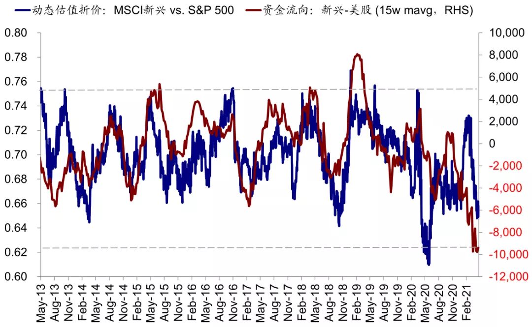 不过,我们注意到近期美股和新兴市场的相对估值和资金流向强弱对比已经到了历史中枢下沿,因此建议小幅减少美股并加仓到新兴,但整体依然低配。
