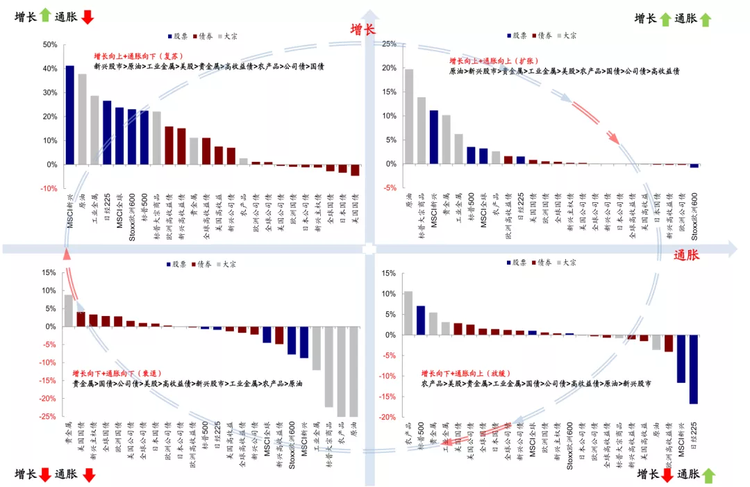 图表: 仿照美林时钟,我们将增长和(8.18, 0.04, 0.49%)通胀按阶段划分,在当前这一阶段大类资产的历史表现中,股票>工业品>原油>信用债>黄金>利率债