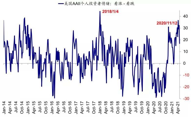 图表: 4月美国个人投资者情绪回落,看涨-看跌比例持续回落