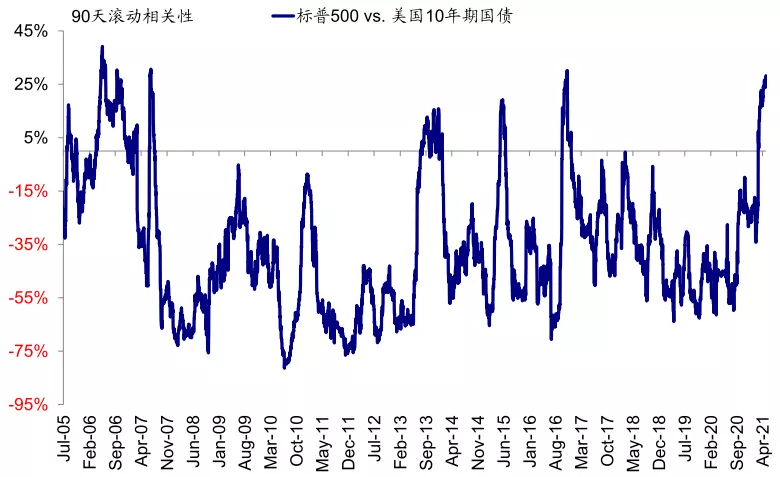 图表: 4月,标普500和美国10年期国债指数的正相关性继续抬升,并接近历史高位