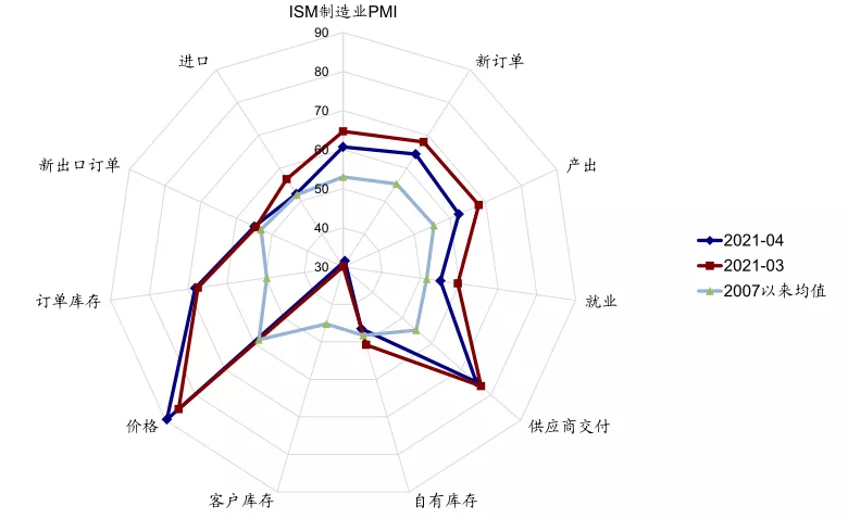 不过,广谱大宗商品的强劲上涨以及美债实际利率回落而通胀预期走高的组合都表明价格压力逐渐增加并可能成为短期焦点。4月美国制造业PMI所反映的也是类似的局面。分项来看,除了价格、在手订单和交付时间外,其他分项都明显回落,但这一回落反过来恰恰说明是供给侧瓶颈加剧导致的价格压力和生产跟不上。