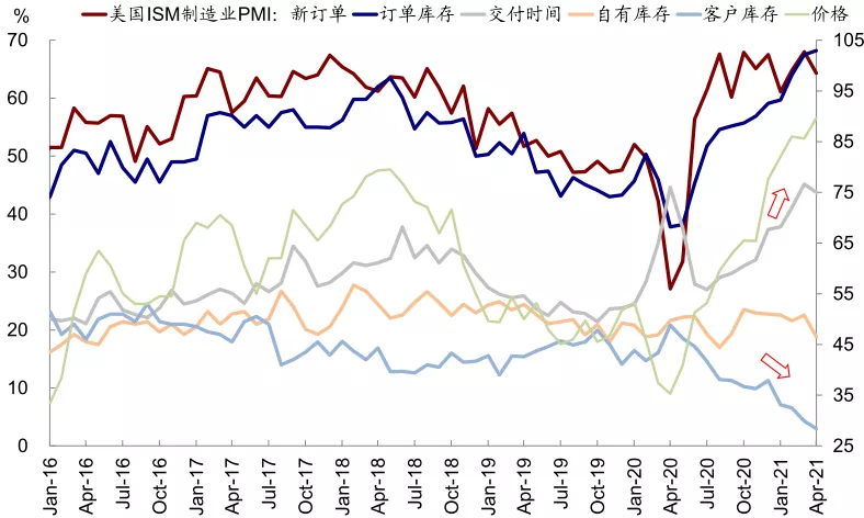 4月美国制造业PMI所反映的也是类似的局面。但复工推进对缓解供需缺口和供应瓶颈应该还是大方向,正如美联储一直强调的那样更多是暂时性因素。