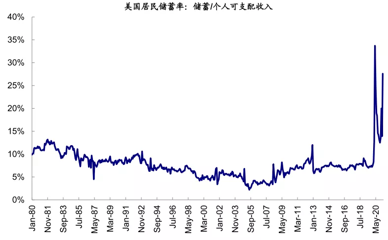 图表:美国居民储蓄率3月份1.9万亿美元刺激后再度跃升至27.6%的高位(仅次于去年4月的33.7%)