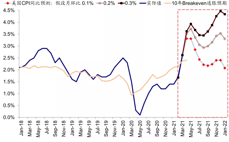 但不可否认的是,近期大宗商品普涨叠加未来两个月CPI在基数效应下仍将不断走高,都可能使得价格变化成为短期市场焦点(我们测算美国CPI同比高点或将出现在5月,高点为3.5~4%)。
