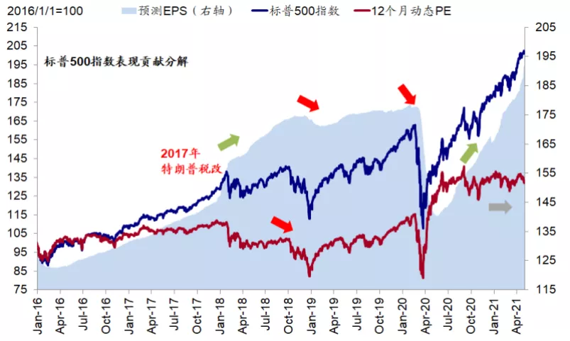 图表: 近期标普500指数持续走高的背后推动因素为盈利的不断上修而非估值