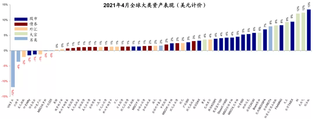图表: 4月全球大类资产表现:美元计价下,大宗>股>债;创业板、天然气、铜、FAAMNG、原油等领涨;VIX多头、比特币、美元等下跌