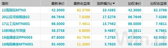 “12青国投MTN3”涨超33%,“20云投可续期债02”涨超17%,“17云工投MTN001”涨超15%,“PR长轨交”涨近11%,“15黔畅达专项债”涨超9%,“19湘潭建设PPN003”涨超7%,“19海国鑫泰MTN001”涨近6%。