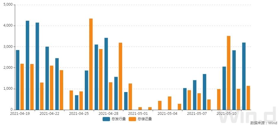 5月12日,债券市场共发行188只债券,总发行量3199.27亿元,154只债券到期,4只债券提前兑付,1只债券回售,无债券赎回,总偿还量1138.89亿元,当日净融资额为2060.38亿元。