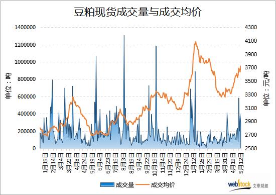 供应紧张预期支撑美豆突破16美元大关,激励豆粕大涨至四个月新高,现货成交价也跟随飙升。5月12日,国内主流油厂豆粕成交缩水,当日总成交量为295800吨,较上日减少94700吨。基差成交量18.85万吨,现货成交量为10.73万吨。成交均价为3722.69元/吨,较上日上涨87.38元/吨,突破逾10周高位。