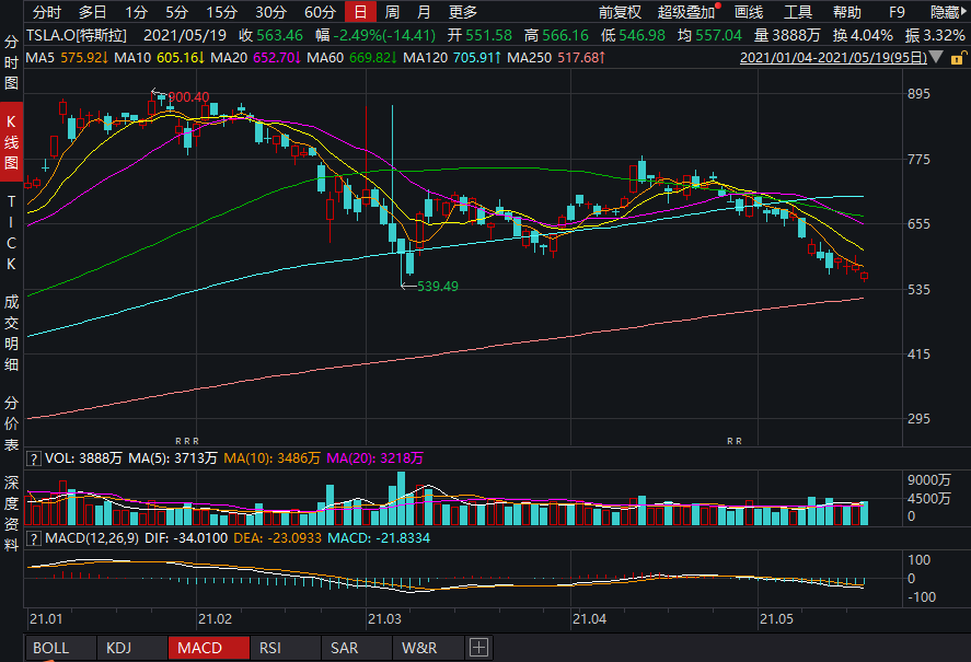 由于通胀担忧引发投资者卖出昂贵资产,特斯拉股价已从1月高点大跌近40%,这给Wood创造了展示自己嗜好的机会,在低点加仓其青睐的科技股。(特斯拉较年内高点已大跌近40%)