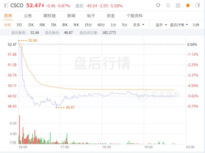 财报公布后,思科股价盘后跌5.58%,报49.54美元。