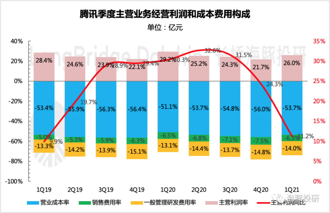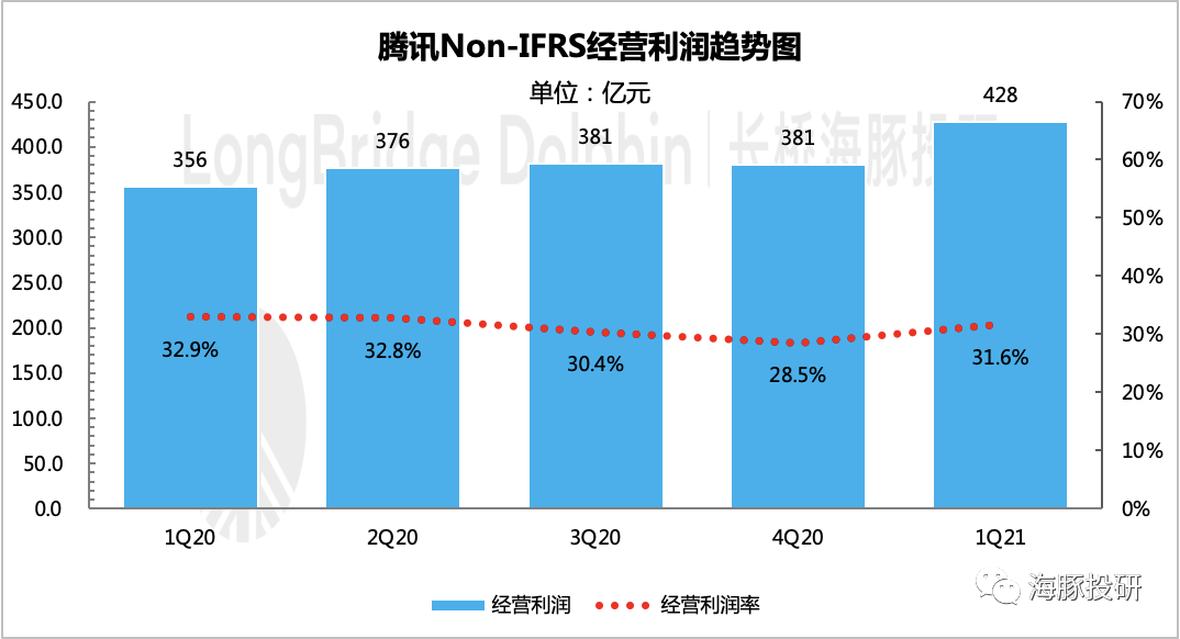 在Non-IFRS下,腾讯一季度实现净利润331亿元,低于市场预期的347亿元。海豚君通过回溯各项收支来看,低于预期的部分主要是由管理与研发费用率的同比提升带来。