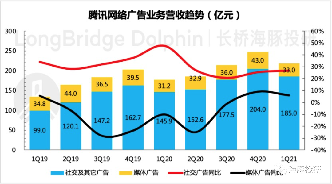 在不同广告类型中,以微信生态为主的社交广告,在本季度中如期稳步推进,同比增长27%。