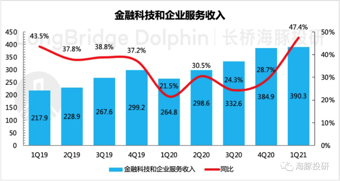 一季度金科企服整体业务实现营收218亿元,同比大增47%,超出市场预期的35%-40%,如海豚君前瞻中预期,腾讯云随项目部署恢复以及企业客户需求增长而加速回暖,线下经济的强势反弹也带来了微信支付业务的继续扩张。