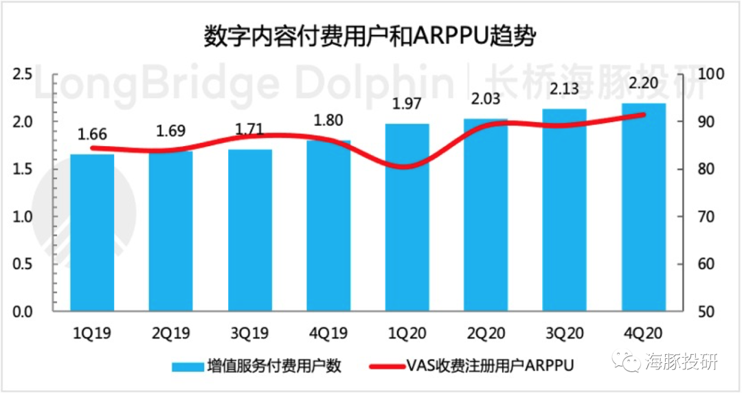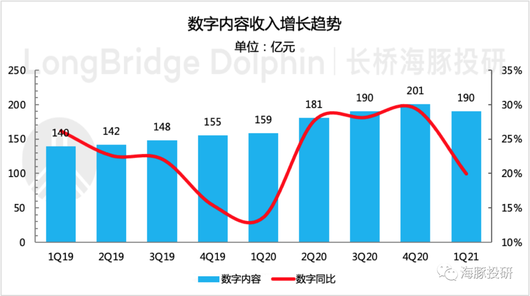 一季度实现数字内容收入190亿元,同比增长20%。从历史情况来看,增长很一般,低于海豚君及市场预期的25-30%。
